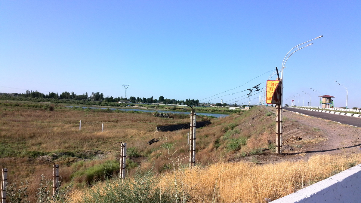 А вы знаете, что нельзя делать фото на мостах? Да! И то ли милиция, то ли кто другой сразу же свистят и всем своим видом говорят, что делать этого нельзя. Поэтому и фото реки по имени Сырдарья хорошими сделать не удалось, а вышло только что-то подобное. Ограждено колючей проволокой — видимо, очень важный объект.