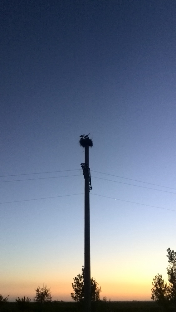 А потом я доехал до них. Это настоящие живые аисты! В пути я уже видел группу этих больших, очень красивых птиц, но это первое гнездо. Признаюсь честно: раньше я думал, что они ненастоящие. Просто когда на машине едешь, ощущение, что они совсем не двигаются, да ещё и стоят так. А оказываются — ещё какие живые. Гнёзда настоящие, и их довольно много — это очень интересно и необычно.