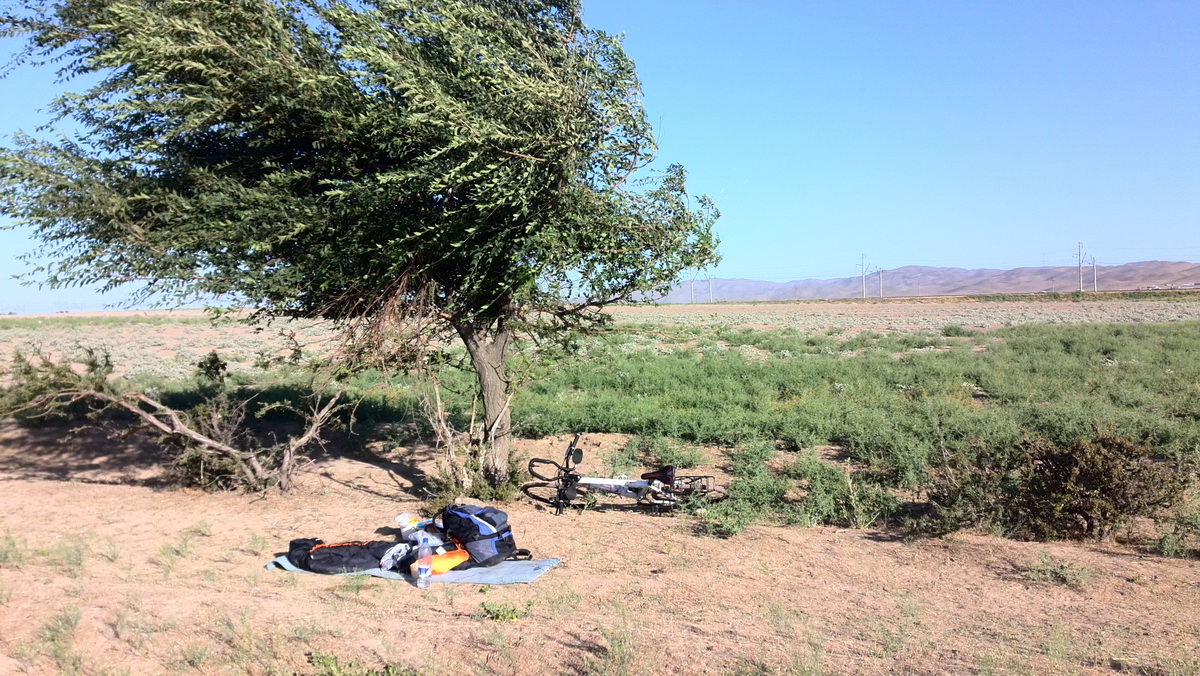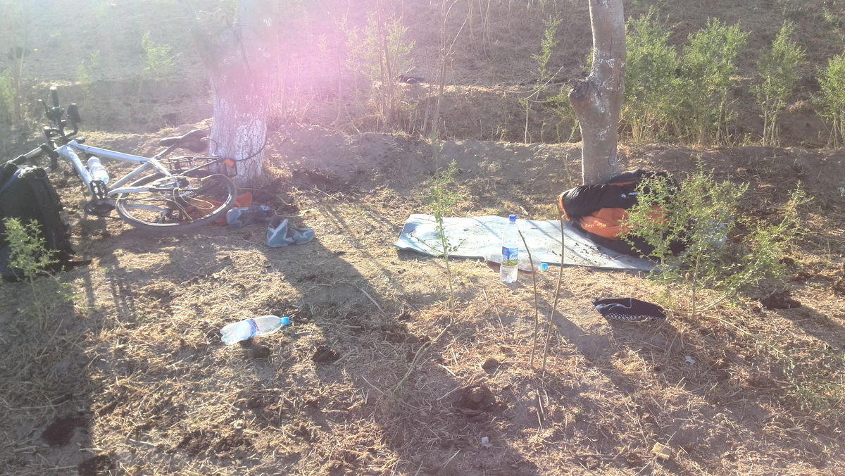 Впереди Джизак. Да, да, он где-то перед перевалом. Но только встав из-за стола или чуть позже, понял, как хочу спать. И, найдя первый приличный тенёк под деревом, остановился на привал. Расстелил каримат и только прилёг — бац! — вырубился).