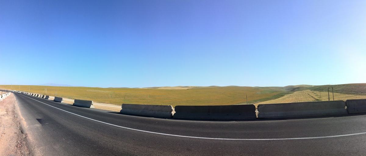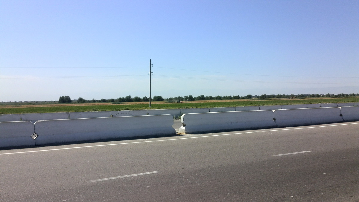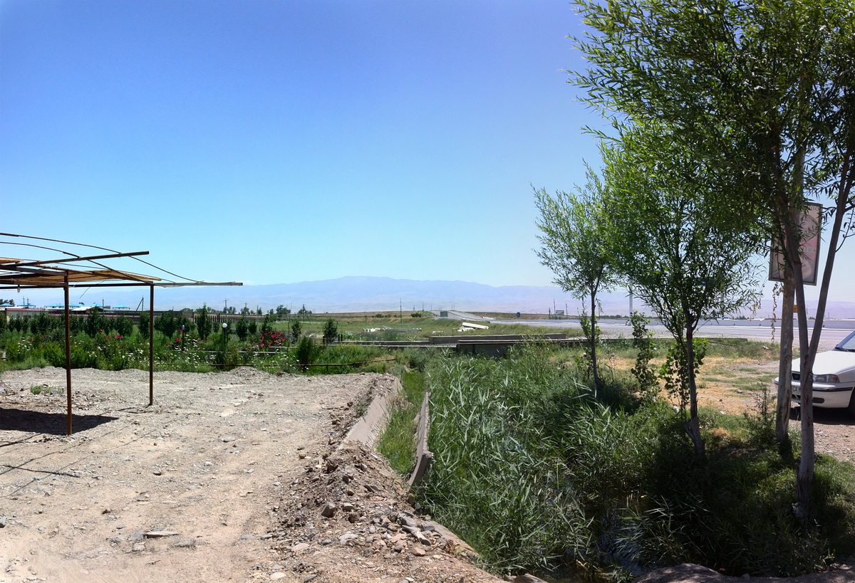 Пейзаж того места не сильно отличался от Ташкентской области. Но значительно меньше мелких посёлков, может, даже и полей меньше (хотя кто его разберёт). Но вдали начали проглядываться горы — да, да, и там есть горы, и даже не такие уж и низкие. А ехать вдоль гор или к горам куда веселее, чем тупо по равнине, где единственное развлечение — это указатели и мосты.