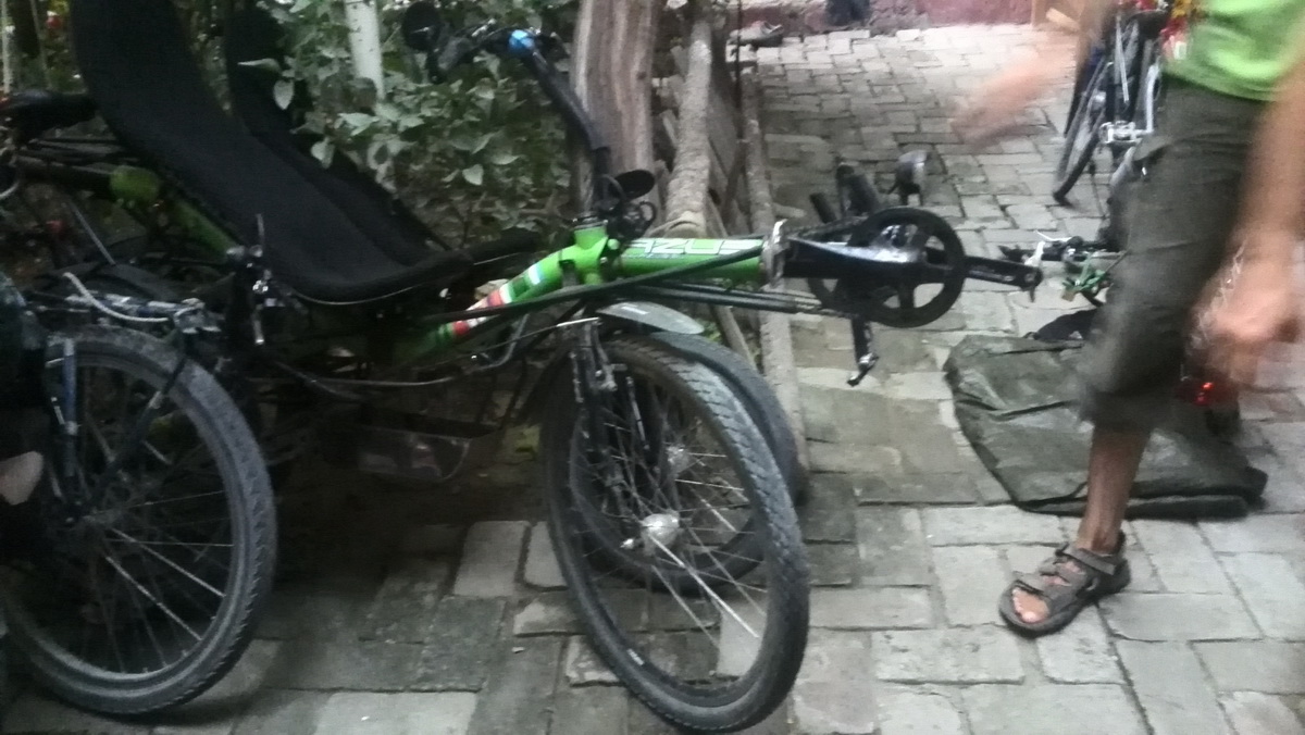 Хочется рассказать немного об их велосипедах. Отличительная черта (ну, что я зафиксировал для себя) — простота конструкции. Ни на одном велике я не увидел амортизаторов — даже на переднем колесе его нет. Большинство рам стальные. Дисковых тормозов мало (на фотке — у одного на заднем колесе). Про гидравлику и говорить нет смысла. То есть максимально простые, и причина этому — чем меньше деталей, тем надёжнее агрегат (ну, я так предполагаю). Хотя, может, взяли что было подешевле. Подслушал, что даже при этом у них случается много поломок, таких как — задняя втулка сломалась пополам (я даже не думал, что так бывает). Колёса у всех средней толщины. Поэтому мой велик рассматривали с интересом, но мельком. Думаю они понимали масштаб моего путешествия по комплектации велака.