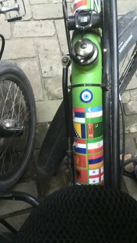 На раме велосипеда расположены флаги стран, что они уже проехали. Теперь там есть и узбекский флаг.