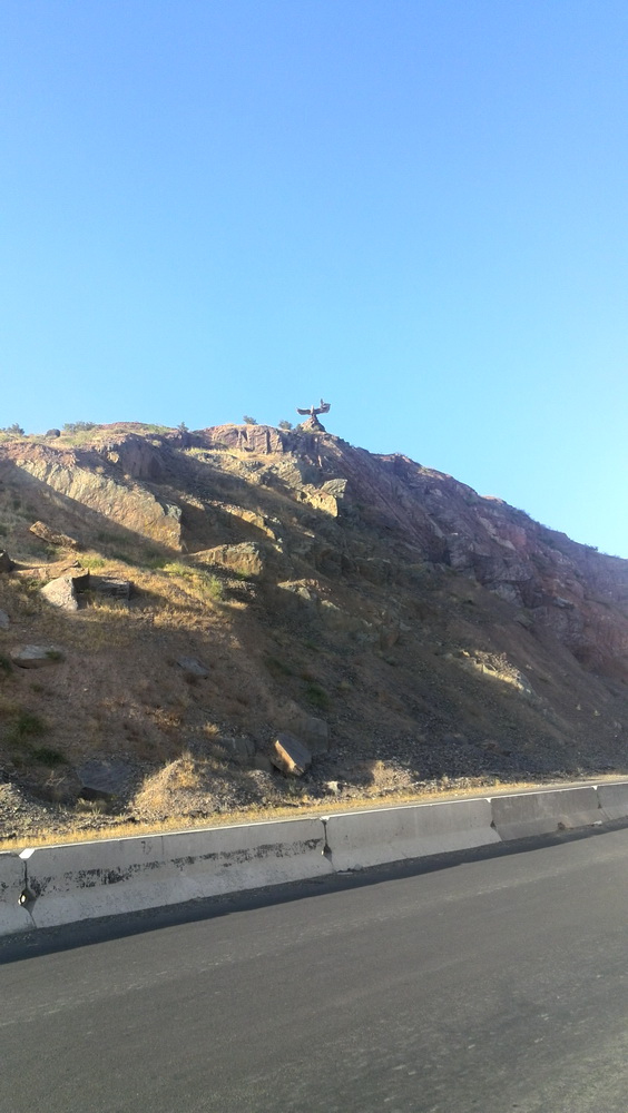 На пике перевала установлена вот такая композиция. Я её распознал как «большая хищная птица, а у левого крыла — птица поменьше, что отгоняет охотника от своего гнезда».
